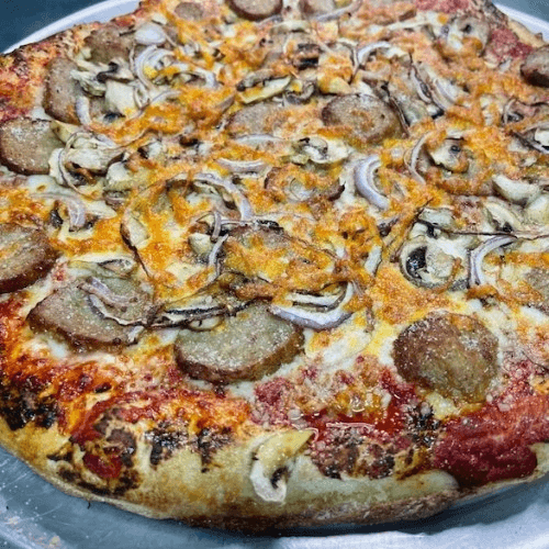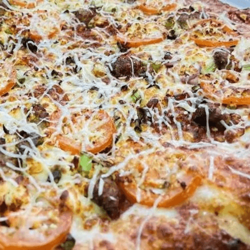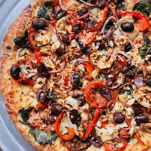 Original red sauce, pepperoni, Italian sausage, mozzarella, red & green onions, sliced roma tomatoes & feta, topped with parmesan cheese