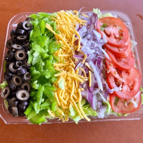 Lettuce, red onions, sliced tomatoes, cheddar cheese, green peppers, and black olives
