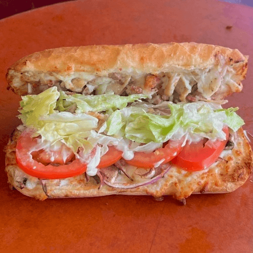 Creamy garlic sauce, tender grilled chicken, crispy bacon, fresh sliced mushrooms, mozzarella, red onions, lettuce, and tomatoes