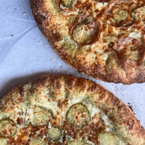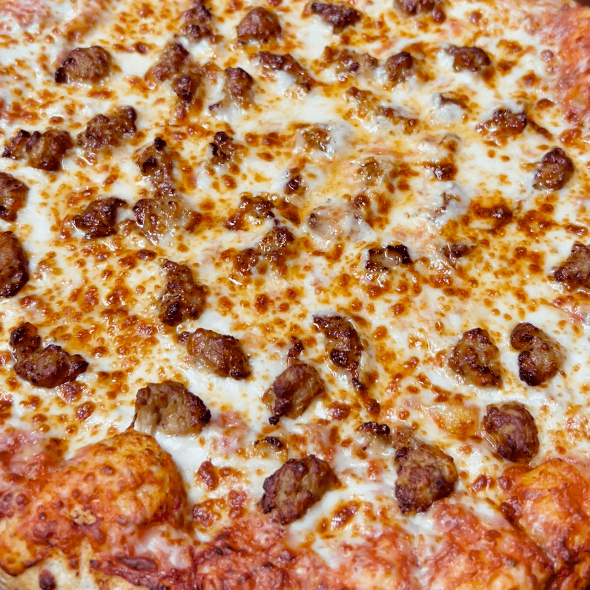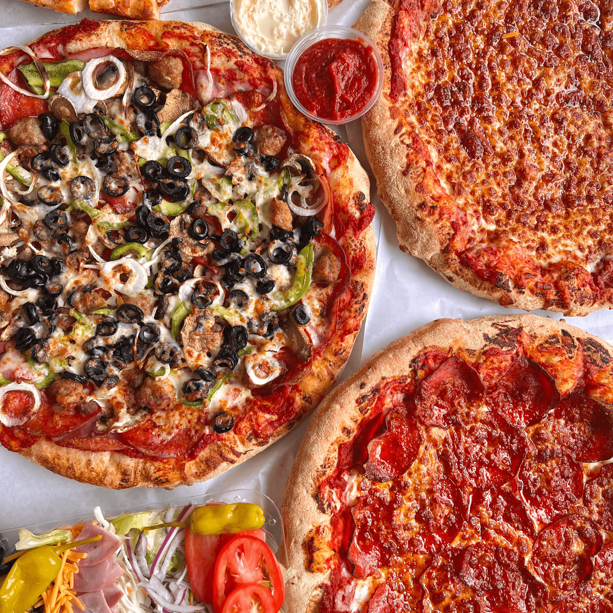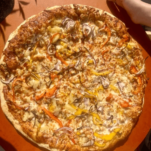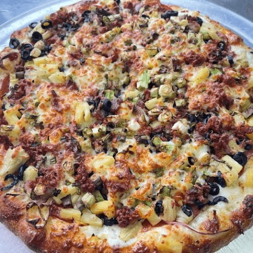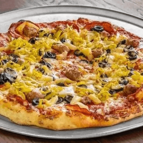 Pepperoni, Italian sausage, sliced black olives, juicy pineapple, mozzarella, topped with pepperoncini