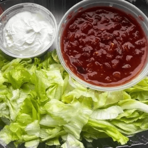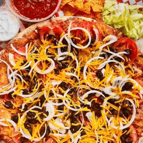 Our own salsa refried bean sauce, seasoned taco meat sliced black olives, onions, sliced tomatoes & cheddar cheese. Also comes with salsa, lettuce, sour cream & doritos chips