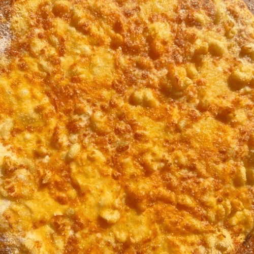 Cheese sauce, tender macaroni, topped with mozzarella, garlic and cheddar cheese