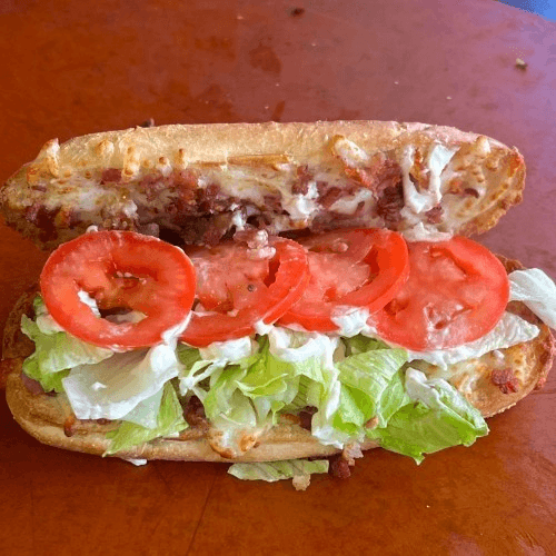 Smoked bacon, mozzarella, topped with lettuce, mayonnaise & sliced tomatoes (on the side)