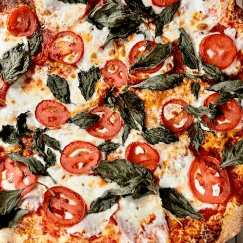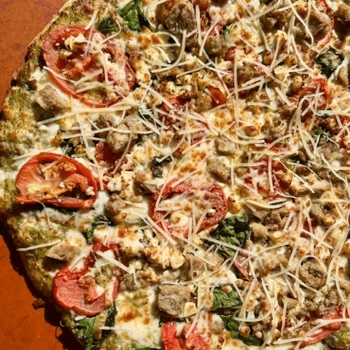 Pesto, tender grilled chicken, mozzarella, spinach, sliced roma tomatoes & feta. Topped with parmesan cheese